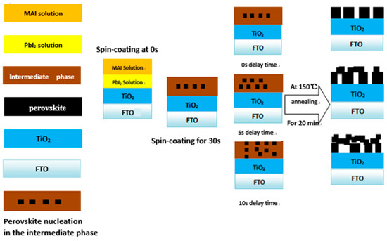 There are many factors that impact the performance of perovskite solar cells, such as the ability to form high-quality perovskite thin films, which is critical to research and development in this area [4,6]. Most of the research work is directed toward the development of perovskite-based solar cells. The growth and properties of CH3NH3PbI3 are also important for the development of perovskite solar cells. This triggered our motivation to research the two-step sequential solution process for the preparation of CH3NH3PbI3 thin films using bare glass substrates and fluorine-doped SnO2 (FTO)-coated glass substrates [1,10]. There are many research groups that study different variations of the two-step method, such as changing the annealing time of PbI2, or changing the immersion time and concentration of the MAI solution in which the sample grows [13,14]. The formed films were analyzed to determine their crystal structure, morphology, elemental composition, chemical state and physical properties [13]. Differently from previous research, we indicate the impact of the delay time before annealing the MAI-PbI2-DMSO intermediate phase on perovskite film quality and photo-physical properties for solar cells [15]. Since the process time for transferring the samples from the spin coater to a hot plate is the same, we define the delay time as: “The sample is allowed to stand on the spin coater for 0 s, 5 s and 10 s.”