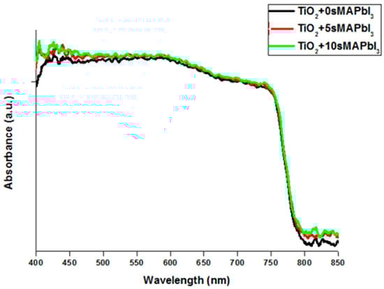 The UV-Vis absorption spectra of the absorption spectra of MAPbI3 perovskite films with different delay times are shown in Figure 4. Figure 4 shows that the curve conforms to the light absorption characteristics of a conventional perovskite film. The three perovskite films have relatively strong peaks between 450 nm and 750 nm. It was found that the absorption rate of the 10 s film was slightly higher than that of the 5 s and 0 s films. With the extension of the delay time before annealing, the number of perovskite nucleation increases, impacting the grain size of the perovskite and the flatness of the film. The rough surface of the thin film gives rise to lower reflectivity light, which enhances the absorption rate [21].