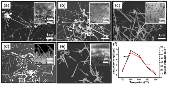 SEM surface images of Ga2O3 NWs grown at various temperatures. (a) 700 °C, (b) 750 °C, (c) 800 °C, (d) 850 °C, (e) 900 °C, and (f) relationship between the length and growth rate of NWs and growth temperature. Inset of (a–e) are magnified cross-sectional SEM images illustrating the length of the NWs. From NWs growth speed, 750 to 800 °C is a promising temperature.