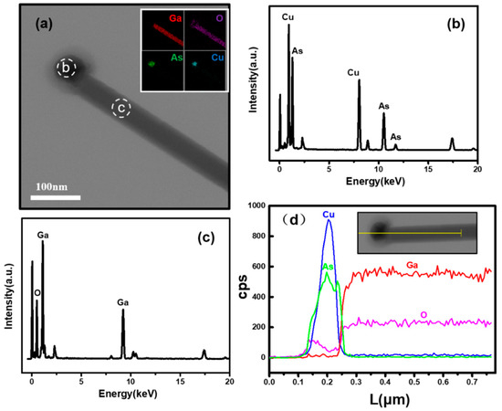 For the further structural and chemical characterization, the Ga2O3 NWs were then investigated using TEM, as shown in Figure 3a, where a typical Ga2O3 NW is observed with a smooth surface and a hemispherical tip. Inset is corresponding EDS mapping of the NW, from which we can see Ga and O are uniformly distributed in the NWs body, and As and Cu are concentrated in the catalytic head. The typical elemental composition and the typical spectra of the tip and body is analyzed by EDS, which are illustrated in Figure 3b,c. More specifically, the element line scan also clearly shows the distribution of the four elements in Figure 3d. These results evidently show that the obtained NWs are Ga2O3 grown via the VLS mechanism with the possible catalytic tips of the Cu-As alloy. It should also be emphasized that no As-related signal is obtained in the NW body within the detection limit of EDS performed in this study. This would be attributed to the fact that Ga2O3 has a far lower Gibbs free energy (approximately −998.3 kJ/mol) than GaAs (−67.8 kJ/mol) [43]. Therefore, it is more preferentially grown from the thermal dynamics point of view. In the meantime, GaAs decomposes at a higher temperature than 650 °C and, thus, As would be hard to bind with Ga. In addition, the introduction of As requires a high-energy ion implantation method. The experimental conditions are extremely harsh and it is impossible to introduce As doping by the conventional CVD method [44,45]. In addition, it is noted that GaAs particles are adopted as the source instead of metallic gallium, since GaAs particles can evaporate Ga to give the precursor in a relatively low temperature of 750 to 800 °C. On the contrary, if metallic Ga is used, it will form a liquid metal and a very high temperature (e.g., 1000 °C, [46]), which is needed to evaporate enough Ga precursors.