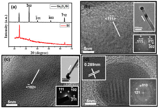 Crystal structure characterizations of the NWs. (a) XRD patterns of the NWs and the Si/SiO2 substrate, (b) HRTEM image of NW grown along the ⟨1⟩ direction, according to FFT images in the inset for one of a representative Ga2O3 NWs, (c) another NW grown along the ⟨02⟩ direction as identified by the SAED pattern in the inset, and (d) HRTEM image and FFT (inset) of the Cu5As2 alloy tips.