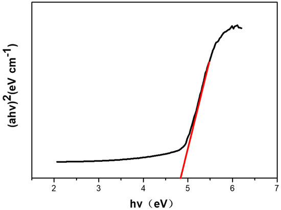 To explore the bandgap information of the Ga2O3 NWs, ultraviolet-visible absorption spectrum is obtained, which is shown in Figure 5. Tauc’s equation was normally adopted, and the bandgap is calculated from the plot of (αhv)2 vs hv. It clearly displays that the band gaps edge lies at approximately 4.85 eV (256 nm) of the β-Ga2O3 NWs grown at 750 °C, according to extrapolated line cuts of the abscissa axis. This is in good agreement with research studies [50].