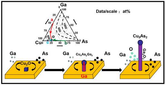 In order to explain the cause of formation of the catalyst head and the mechanism of phase transformation, liquidus projection of the Cu–As–Ga system is shown in Figure 6 [54,55,56]. Three vertices of a triangle represent three pure components of Cu, As, Ga, respectively, and three sides of the equilateral triangle, which indicate the alloys formed by the corresponding two elements. The red, green, and blue lines are Ga-Cu, Cu5As2, and Cu3As binary alloy equilibrium lines. From the phase diagram, ternary eutectic point temperature is under 700 °C and, at this ternary eutectic point ‘o’, the contents of three components are Cu: 73%, As: 25%, and Ga: 2%, which is in good agreement with our experiment results of Cu: 69.43% and As: 30.57% (atomic ratio). The incorporation and deposition of Ga would follow the red line in the phase diagram, and the content of Ga is decreasing from ‘a’ to ‘o.’ Lastly, at the end of the growth process, Ga species in the catalyst alloy droplets were consumed in the formation of Ga2O3 NWs, while the remaining Cu and all the As species were solidified to the Cu5As2 phase. To conclude, continuous Ga atoms flow into the CuxAsyGaz sophisticated phase and increase the super-saturation of the alloy. Therefore, it pushes NWs interfacial layer growth, which proceeds until the temperature is naturally cooled to room temperature. The reaction can be described as Equations (2)–(4) [19].