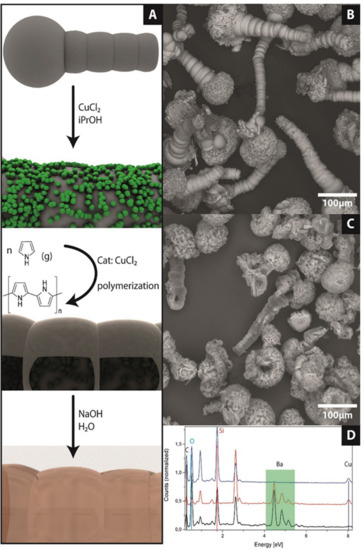 Polypyrrole has gained attention due to its ability to produce polymer replicas of biominerals like sea urchin spines [25]. Recent breakthroughs in the preparation of polymer replicas on the micro scale are a huge improvement to preserve fragile structures and it now seems transferable to silica-biomorphs [23]. To obtain a full pPy coating around a biomorph we followed the route presented in Figure 3A. At first CuCl2 is brought onto the structure as a catalyst. Due to the rough surface of the naked biomorph, many small crystals of CuCl2 attach on the surface. These small crystals do not affect the shape as can be seen in Figure 3B. After drying, the structures were transferred into a desiccator. On the bottom of the desiccator, pyrrole was deposited creating a pyrrole saturated atmosphere. The pyrrole molecules diffuse to the catalyst and begin to polymerize. During this process, a colour change of the biomorphs can be observed by the naked eye. After 3 h the white powder turns grey and after 6 h a black powder was obtained. To ensure that the polymer layer is neither growing too big nor crosslinks the structures, the incubation time was kept at 6 h. After extracting the structures from the desiccator, the shapes of the naked biomorphs used as starting material remained nearly unchanged. Elemental analysis via energy dispersive X-ray spectroscopy (EDX) showed Ba, Cu, Cl, C, O, N and traces of Si. Except the higher amount of N and the signals from the catalyst, the spectrum looks identical to an EDX of the naked biomorphs. The most meaningful proof of the full coverage and subsequent preservation of the biomorph form is the dissolution of the inner core which was achieved with 0.05 M acetic acid. The core dissolves much slower compared to normal silica-biomorphs and as a result hollow structures were obtained and shown in the SEM image in Figure 3C. Note that the SEM images were recorded with a backscatter detector, which gives a good material contrast. The structures in Figure 3B show a higher contrast compared to the hollow structures without BaCO3 in C. The EDX spectrum of these polymer replicas as well as their preliminary stages are shown in Figure 3D. The black spectrum shows the silica-biomorphs, the red spectrum the naked biomorphs with CuCl2, which can be found at 8.02 eV. Here we can see that the outer silica layer has vanished and no Si signal was measured at 1.75 eV. In the upper blue spectrum, the Ba signals (green rectangular outline) have vanished and only traces of the raw material (Ba: 0.24; Si: 0.25 at.%) and the catalyst (0.4 at.%) are detected. The main component consists of carbon and nitrogen. Therefore, the pPy route is most suitable to preserve micro-sculptures on the microscale and to obtain conductive inverse biominerals.