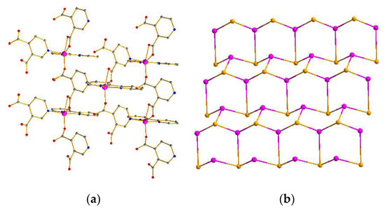 Compound 2 crystallizes in the orthorhombic system with the P212121 space group. The asymmetric unit of crystal 2 consists of one Co atom, one L1 ligand, and one 2,2-bypyridine. As depicted in Figure 2a, the Co center adopts a distorted heptacoordinated pentagonal bipyramid configuration through the coordination of three nitrogen atoms from one 2,2-bypyridine and one L1 ligand, and four oxygen atoms from two individual L1 ligands in a chelating mode (Figures S3 and S4). The Co–O (Co–O = 2.0642 Å−2.7512 Å) and Co–N (Co–N = 2.1052 Å−2.1340 Å) distances are quite similar to the normal ranges [27,28,29,30,31]. The L1 ligand adopts a bidentate coordination mode and utilizes one nitrogen atom to connect three Co atoms with the Co···Co separations of 0.7395 nm, 0.7714 nm, and 0.9977 nm. The neighboring three Co atoms are bridged by six L1 ligands into a 2D hexagonal (6,3) network (Figure 2a) with hcb topology (Figure 2b) [32,33,34,35]. Furthermore, the adjacent layers are further linked into a 3D supramolecular architecture by π–π interactions between the 2,2-bipyridine molecules with center-to-center distances of 3.66−3.80 Å (Figure S8) [36,37,38,39,40].