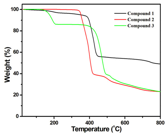 The diffraction peaks of compounds 1–3 were confirmed with good agreement between the experimental (black line) and simulated PXRD patterns (red line) (Figures S10–S12), and the phenomenon indicates that the synthesized compounds 1–3 have good phase purity.
