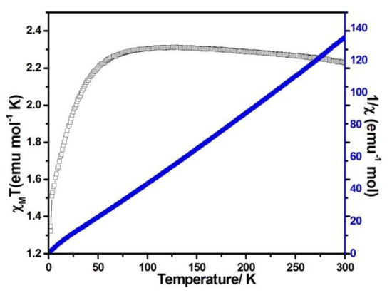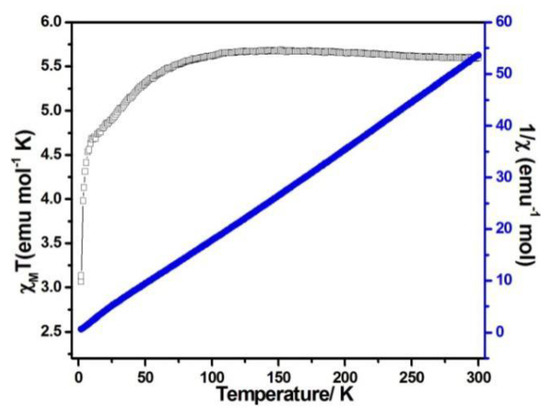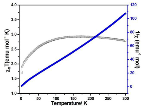 When the magnetic field was 1000 Oe and the temperature was in the range of 2–300 K, the variable temperature magnetic susceptibility of compounds 1–3 was measured. The curves of χMT and χM−1 vs. T of compounds 1–3 are presented in Figure 5, Figure 6, and Figure 7, respectively. The χMT value of compound 1 at 300 K was 5.60 emu·K mol−1 for a Co2 unit, where the value was much higher than the theoretical χMT value of the spin-only one for two isolated Co2+ ions (3.75 emu·K mol−1 and S = 3/2), which is mainly due to the spin-orbit coupling of the high-spin Co2+ ions. Upon the temperature cooling to 50 K, the χMT value was kept roughly constant. Nevertheless, it decreased suddenly and gave the χMT value 3.07 emu·K mol−1 at 2 K. The sudden decrease below 50 K was due to the antiferromagnetic coupling between the paramagnetic centers and the zero-field splitting (Figure 5). The χMT value of compound 2 at 300 K was 2.79 emu·K mol−1 for a Co ion, where the value was much higher than the theoretical χMT value of the spin-only one for one isolated Co2+ ion (1.875 emu·K mol−1 and S = 3/2), but it still fell within the usual range for octahedral Co2+ ions in the 4T2g state. Upon the temperature cooling to 50 K, the χMT value was kept roughly constant. The phenomenon is reminiscent of antiferromagnetic behavior (Figure 6). The χMT value of compound 3 at 300 K was 2.23 emu·K mol−1 for a Co ion, where the value was much higher than the theoretical χMT value for one isolated Co2+ ion (1.875 emu·K mol−1 and S = 3/2), though it fell within the usual range for octahedral Co2+ ions in the 4T2g state. The χMT value was kept roughly constant until the temperature decreased to 50 K, suggesting a ferromagnetic interaction between Co ions (Figure 7). Curie−Weiss law was used to fit the χM−1 data from 2–300 K, acquiring θ = −1.77 K, C = 5.67 emu·K mol−1 for compound 1. The negative θ value and χMT trend with temperature fully demonstrated an antiferromagnetic effect of compound 1. In compound 2, the parameters C = 1.0 emu·K mol−1 and θ = 0 K indicated an antiferromagnetic effect of compound 2, while in compound 3, giving C = 2.2 emu·K mol−1 and θ = 6.5 K, a ferromagnetic effect was suggested between the Co2+ ions (Table 2) [24,25].