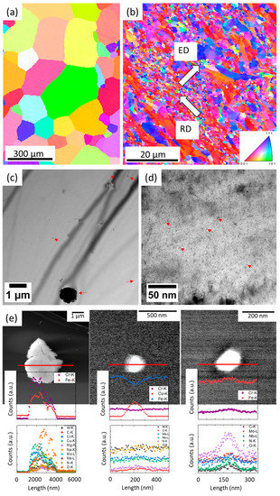 Bulk texture measurements were performed at room temperature by neutron diffraction on a HIPPO (the HIgh Pressure Preferred Orientation) instrument at a pulsed neutron spallation source at LANSCE [19]. Samples were glued onto standard HIPPO holders which were located ~9 m from the neutron moderator. Diffracted neutrons were collected by 1240 3He tubes arranged on panels distributed over five conical rings, and the samples were rotated around the vertical axis at 0, 67.5, and 90°. The diffraction data was analyzed by Rietveld analysis using the E-WIMV texture algorithm with a 10° resolution of the orientation distribution function (ODF). Moreover, the microstructure and recrystallization fractions were determined by electron backscattered diffraction (EBSD), using an FEI Inspect field emission gun (FEG) scanning electron microscope (SEM), equipped with a TSL EBSD detector. Ex situ transmission electron microscopy (TEM) and energy dispersive X-ray scattering (EDX) were conducted to determine the distribution and types of the second-phase particles. Line scans across the grain boundaries were performed along the lines having different lengths, depending on the size of the particles, with ~1.5 s dwell times using the FEI Tecnai F30 microscope at 300 kV equipped with an EDAX EDX detector. In order to observe the mechanism of microstructure evolution at the temperature of ex situ annealing—1100 °C, in situ annealing experiments were performed using an intermediate voltage electron microscope (IVEM) at the same temperature, at Argonne National Laboratory. For this experiment, a Gatan high-temperature holder having a Tantalum furnace was utilized, with a heating rate of ~50 °C/min. Also, a Gatan OneView camera with a resolution of 4000 by 4000 was used to capture video during annealing. It should be noted that for the samples for EBSD, in situ and ex situ TEM investigations were prepared by jet electropolishing (using a Tenupol-5 equipment), using a solution of perchloric acid (5%) and methanol at –40 °C with an applied voltage of 20 V.