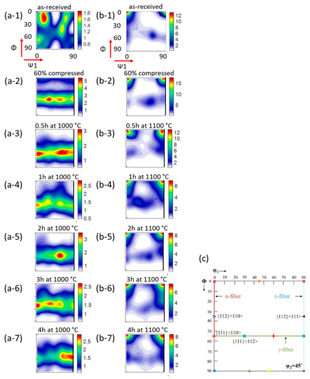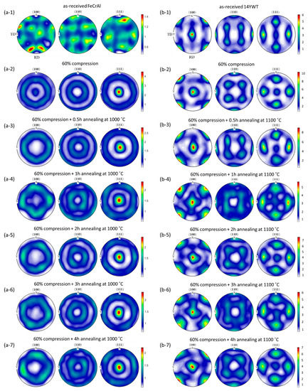 Pole figures showing the evolution of the texture after deforming to 60% and annealing ((a-1) to (a-7)) at 1000 °C for up to 4 h in the FeCrAl alloy, and ((b-1) to (b-7)) at 1100 °C up to 4 h in the 14YWT alloy.