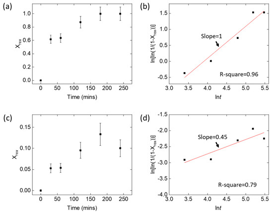 (a) Recrystallization fraction as a function of time, (b) plot of ln[ln(1/(1 − Xrex))] as a function of lnt in the FeCrAl alloy annealed at 1000 °C; (c) recrystallization fraction as a function of time, (d) plot of ln[ln(1/(1 − Xrex))] as a function of lnt in the 14YWT alloy annealed at 1100 °C.