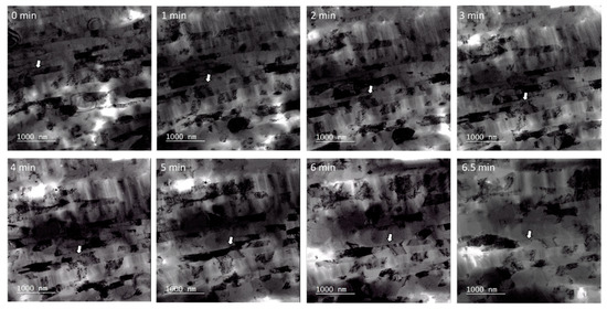 14YWT alloys are extremely stable at high temperatures. In 60% compressed samples, recrystallization and growth start at 1100 °C; however, even at this temperature, the kinetics are sluggish. While ~5% is recrystallized after 30 min of annealing, only ~10% is recrystallized after 4 h of annealing at this temperature. Figure 5 shows the microstructure evolution at 1100 °C under TEM. After 6.5 min of annealing at 1100 °C, there are subtle changes in the microstructure. Rather than the nucleation of new grains, two lamellar grains combine and form a thicker grain, while some part of the initial grain remains unchanged, as indicated by the white arrows in Figure 5. Supplementary Video I also shows the in situ evolution of grain structure at 1100 °C. This indicates that at the beginning, secondary recrystallization, which can be nominated as abnormal grain growth, is the dominant mechanism in this alloy, rather than primary recrystallization which results in the formation of strain-free new equiaxed grains. However, after half an hour of annealing at 1100 °C, a few strain-free equiaxed grains could be seen, agreeing with our previous findings and the literature reporting the simultaneous occurrence of recrystallization and abnormal grain growth at above 850 °C [8,9]. In 14YWT alloys, due to the existence of different volume-fraction nanoparticles inside different grains and bimodal grain size distributions, the stored energy throughout the microstructure is not homogenous [8]. These were reported to be the main reasons for abnormal grain growth in materials having nanoparticle dispersions. Therefore, the recrystallization behavior is closely related to the nano-particle and dislocation contents, as well as the sizes of the subsequent grains. The initial dominance of the abnormal grain growth in this study can be attributed to the large inhomogeneity in the microstructure as a result of the extensive deformation.