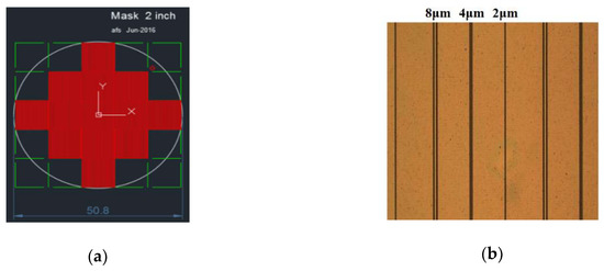 Initially, a 2-inch mask was constructed with waveguide patterns at various widths, as shown in Figure 1a. After that, commercial 2-inch sapphire substrates with a 5 μm GaN thin film epitaxially grown by MOCVD were cleaned with a standard RCA procedure in an ultrasonic bath with acetone, isopropanol and de-ionized water for 3 minutes each sequentially. Subsequently, 2 μm of Tetraethyl Orthosilicate (TEOS) oxide was deposited to form the SiO2 layer on top of the wafers as the first etching barrier by plasma enhanced chemical vapor deposition (PECVD). Next, a PR-5214 photoresist with a thickness of 1.5 μm was spin-coated on the substrate wafers. An exposure system was used to develop the desired waveguide patterns (2, 4 and 8 μm, respectively), as shown in Figure 1b.