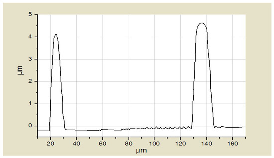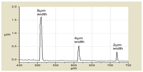 The top of the sapphire substrate was covered with a 5 μm thick GaN epilayer. Initially, only one single photoresist (PR) layer was used as an etching barrier. To shape the perfect waveguide with etching to the sapphire substrate, a long etching time (1500 s) was used. However, after the etching process, the etching resistance of the PR mask was neither as expected nor sufficient to provide a deep etch of 5 μm in the GaN. The resulting waveguide displayed a damaged surface and damaged side walls, as shown in Figure 2. This is clearly unacceptable for use as a waveguide. In addition, the waveguides were characterized with a profilometer. The surface profiles are shown in Figure 3. The height of the waveguide is not uniform, and the non-uniform exposure has almost destroyed the 2 μm wide waveguide.
