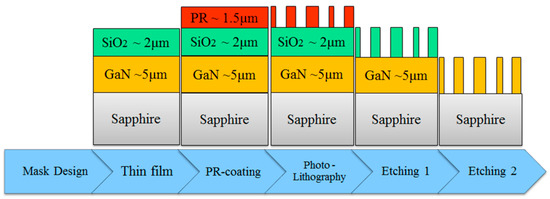 In order to improve the etching process, an extra oxide layer of TEOS, which acted as a precursor for the deposition of SiO2, was deposited on top of the GaN layer by PECVD before the photoresist coating. After the development of the photoresist coating, Ar and CF4 gases were used as etchants to remove the photoresist barrier layer while the SiO2 layer acted as an etch barrier to protect the GaN. Since the SiO2 layer is relatively stable in the etching process, it blocks etching gases such as Cl2 and BCl3. Figure 4 shows the etching process. To improve the deep etching and to reduce the complexity of the process, the relevant parameters were optimized. In the initial stage of the experiment, a selectivity ratio of 1:1 of the photoresist to GaN was chosen. However, a spin-coating photoresist with a thickness of 5 μm is difficult to form in the lithography process. SiO2 was added to the photoresist layer in the manufacturing process. SiO2, deposited by PECVD as an ICP etching barrier, is commonly used in semiconductor processing and exhibits an excellent deposition uniformity at high selectivity ratios. Therefore, Ar and CF4 gases were first used to etch out the layer pattern of the SiO2 barrier. Subsequently, Cl2 and BCl3 gases were used to etch the GaN layer with the etching parameters listed in Table 1.