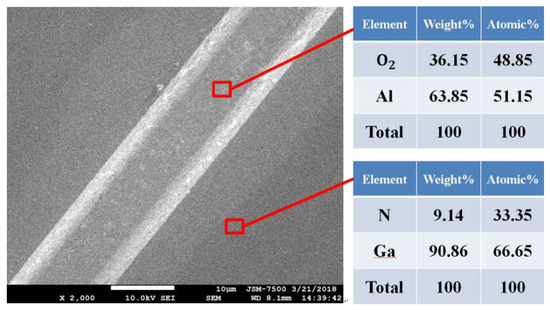 Figure 5 displays a FESEM image and elemental atomic percentage of a GaN waveguide coated with an SiO2 layer as an etching barrier. The etching time was 1500 seconds. A comparison of Figure 2 and Figure 5 demonstrates that an extra oxide layer, SiO2, greatly reduced the roughness of the GaN waveguide surface (for a fixed etching time of 1500 s), and enabled a 5 μm-deep GaN etching of the sapphire substrate. Etching parameter combinations should be analyzed in the future to optimize results. The scanning electron microscopy (SEM; JSM-7500F, JEOL, Tokyo, Japan) image and elemental composition (energy dispersive spectroscopy, EDS; INCA X-ACT, OXFORD, High Wycombe, UK) in Figure 5 indicate the success of the above process with proper etch selectivity ratios to produce the desired GaN waveguide. Figure 6 displays the results of a 5 μm-deep etching. Through this process, a useful GaN waveguide was fabricated.