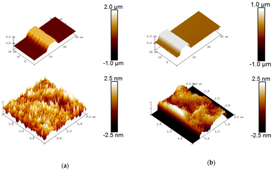 Both the steepness and the surface roughness of the waveguides are characterized. Figure 7a,b shows the 3D images of the fabricated waveguide without the SiO2 layer in the etching process and with it, respectively. All 3D waveguide images were obtained with an atomic force microscope (AFM; NT-MDT Solver P47, NT-MDT Spectrum Instruments, Moscow, Russia) system in the Taiwan Semiconductor Research Institute (TSRI). A similar surface roughness and sidewall properties were observed in the GaN waveguide with the SiO2 layer during etching. This also indicates that the SiO2 layer, when used as an etching barrier, is an effective method for fabricating GaN waveguides.