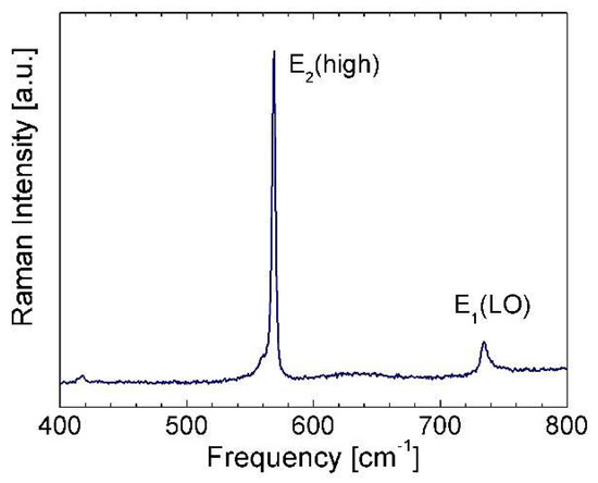 Figure 9 displays a Raman spectrum of a GaN waveguide structure using a micro-Raman setup. The excitation wavelength was 632 nm. We observe vibrational bands at 567 cm−1 and 735 cm−1 that are assigned to the E2(high) and E1(LO) modes, respectively [16]. The shoulder at 560 cm−1 is attributed to the E1(TO) mode. These vibrational modes are characteristic of the GaN wurtzite structure.