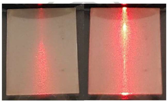 Due to the high refractive index of GaN, coupling into the waveguide using prisms poses difficulties. Therefore, the beam from a Helium-Neon laser was injected into the waveguide by end-face coupling via a 20x microscope objective. However, achieving a high-efficiency coupling was not easy, as suitable angles of incidence and a small laser spot were required. The waveguide thickness was only about one percent of the substrate. Figure 10 shows a well coupled beam in comparison to the uncoupled case. The propagation of the coupled beam is clearly seen in the right panel of Figure 10. In particular, the cross section of the exiting beam is visible at the end-face. This indicates that the etching has resulted in a high quality GaN waveguide that can be further used for spectroscopy with evanescent excitation. Further studies to quantify the propagation and coupling losses are in progress.