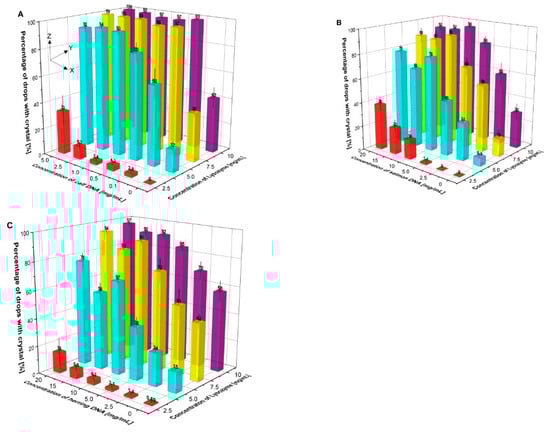 In this study, the degree of crystallizations was evaluated by crystal quantity denoted as crystal percentage, the percentage of crystallized drop. Higher difference of crystal percentage compared with control indicated a greater effect to enhance protein crystallization. Figure 1 demonstrated the percentage of crystallized drops with various concentrations of lysozyme (2.5–10 mg/mL) and DNA (0.1–20 mg/mL) on the seventh day (original data in Tables S1–S12). The control experiment without DNA addition was shown as the leftmost column for each lysozyme concentration. As depicted in Figure 1A, it was found that along x-axis, the percentage of crystallized drops increased with DNA concentration when calf DNA with molecular weight ~9900 kDa was utilized. At the lysozyme concentration of 2.5 mg/mL, the crystal percentage in average increased from 0% for blank sample to 2.8% and 33% with the presence of calf DNA at the concentration of 0.1 and 5.0 mg/mL, respectively. A similar trend was also observed for other lysozyme concentrations, showing that the crystal percentage increased proportionally with DNA concentration.