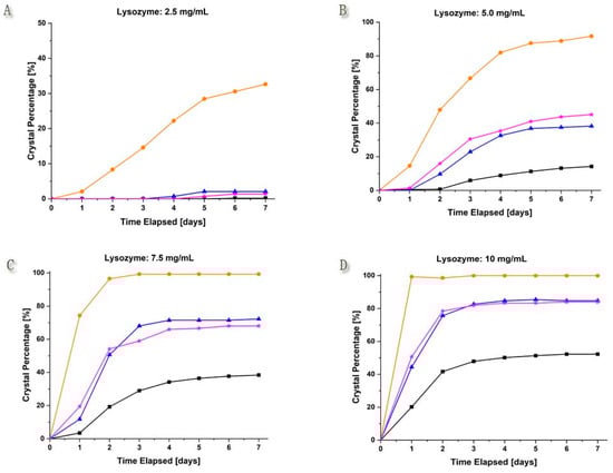 Crystal percentage over a period of 7 days with 5.0 mg/mL calf DNA (orange line with dots), 5.0 mg/mL salmon DNA (pink line with stars), 5.0 mg/mL herring DNA (blue line with triangles) and Blank (black line with square) at lysozyme concentration of (A) 2.5 mg/mL, (B) 5.0 mg/mL, (C) 7.5 mg/mL, and (D) 10 mg/mL at 4 °C.