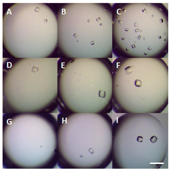 A typical set of crystal pictures with 10 mg/mL lysozyme on the first day using (A) 0 mg/mL calf DNA; (B) 1.0 mg/mL calf DNA; (C) 5.0 mg/mL calf DNA; (D) 0 mg/mL salmon DNA; (E) 10 mg/mL salmon DNA; (F) 20 mg/ mL salmon DNA; (G) 0 mg/mL herring DNA; (H) 10 mg/mL herring DNA; and (I) 20 mg/mL herring DNA (scale bar: 600 μm).