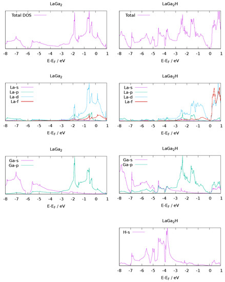 The density of states at the Fermi level has a large d contribution from lanthanum for the Zintl phase, emphasizing the metallic character of LaGa2 (Figure 4), while electrons at the Fermi level in AeTr2 and AeTrTt (Ae = Ca, Sr, Ba; Tr =Al, Ga; Tt = Si, Ge) are rather located in the polyanion [56,58,60]. This is supported by the expansion of the bond lengths in the polyanion for alkaline-earth-containing compounds, while the Ga-Ga distance in LaGa2H0.71 is almost unaffected, since mostly d states are depopulated.