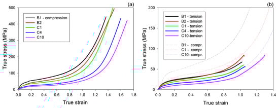 Representative true stress–true strain curves determined for samples of iPB-1 homo- and copolymers deformed at room temperature: in the plane-strain compression (a); and in tension (b). In (b), the compression curves are added for comparison and plotted with thin dashed lines.