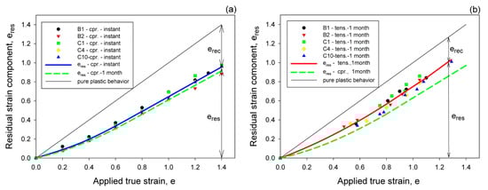 Samples deformed to a given strain, either in compression or tension, and then unloaded demonstrated a strong strain recovery, related primarily to the elasticity of the molecular network within amorphous phase [46,47]. Generally, the recovery behavior of iPB-1 deformed at room temperature observed here was similar to that found in other polymers, although it appeared stronger than recovery of polymers of higher crystallinity, e.g., linear polyethylene [46,47]. Most of the recovery is almost immediate, although several weeks were required to complete the recovery process—cf. Figure 2a, where the lines representing the instant and one-month-recovery after compression are plotted. The points in this figure represent the instant recovery of samples of various comonomer content, characterized by different crystallinity. It appeared that for all compositions the recovery was substantial and there were only minor differences among the samples. Generally, the residual strain left in the sample after a given recovery period decreased slightly with increasing content of the comonomer, thus with decreasing crystallinity.