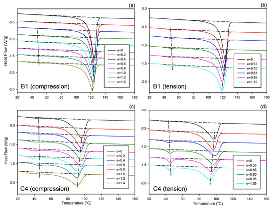 DSC melting thermograms of the deformed samples of B1 (a,b), representative for homopolymers and copolymer of low ethylene content (B1, B2, C1); and of C4 (c,d), representative for copolymers of high ethylene content (C4, C10). Curves in (a,c) represent samples deformed in compression, while those in (b,d) represent samples deformed in tension. The strains indicated in the plots.