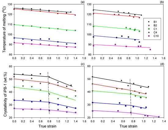 The dependencies of the melting temperature (a,b) and iPB-1 crystallinity evaluated from the area of the main melting peak (c,d) on true strain applied in compression (a,c) and tension (b,d). The crystallinity was calculated with respect to the weight fraction of the iPB-1 species in the sample. Symbols of samples are indicated in (b). Straight line segments were drawn to guide the eye only, and they do not represent any real dependence.