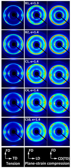 Samples of homo- and copolymers deformed in plane-strain compression demonstrated a more complicated and diversified texture—samples of high comonomer content, C4 and C10, showed the texture resembling the fiber texture, similar to tensile samples, although slightly weaker. Samples of B1 and B2 homopolymer and C1 copolymer demonstrated, in turn, a two-component texture consisting of the fiber-like component and additionally a tilted component, recognized in the CD-view patterns as additional diffraction arcs of (110) and (300) planes, away from LD. The orientation in all compressed samples seemed slightly weaker than in the respective tensile samples.
