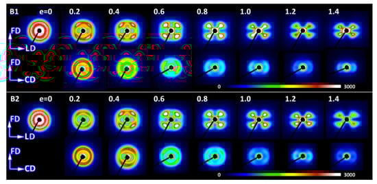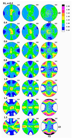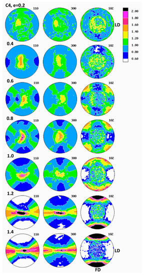 Figure 6 presents the set of pole figures determined for the B1 homopolymer deformed by the plane-strain compression to increasing true strains in the range of e = 0.2–1.3, whereas Figure 7 shows a similar set determined for copolymer C4, also deformed in plane-strain compression to the true strain ranging from 0.2 to 1.4. Comparing these pole figures of B1 (Figure 6) and C4 (Figure 7) with the respective pole figures determined for B2, C1 and C10 samples (selected pole figures presented in Figure 8, Figure 9 and Figure 10, respectively) one can find that the pole figures determined for B2 homopolymer are very similar to and show practically the same features as the respective figures obtained for B1 homopolymer, while the set of C4 pole figures can be considered as a good representative for the whole series of copolymers (C1, C4 and C10).