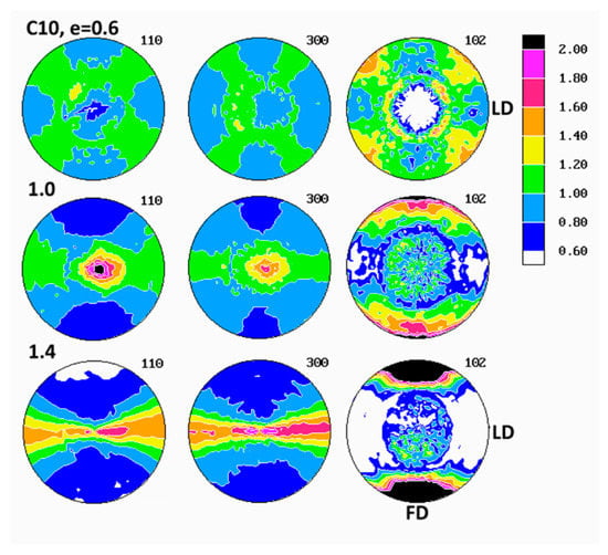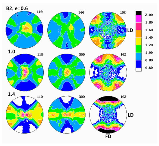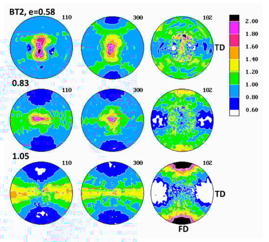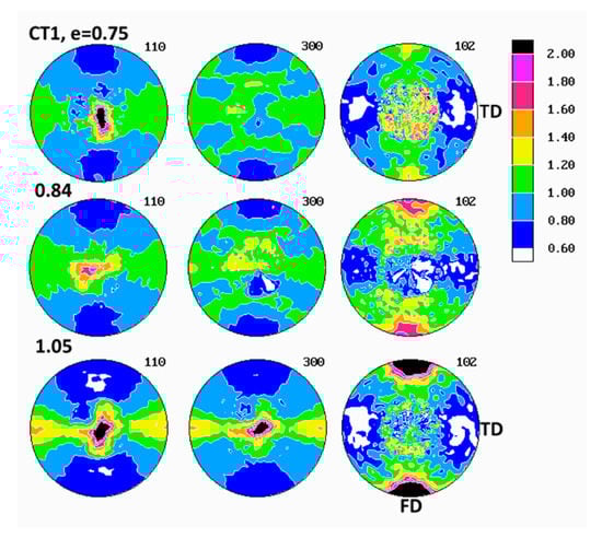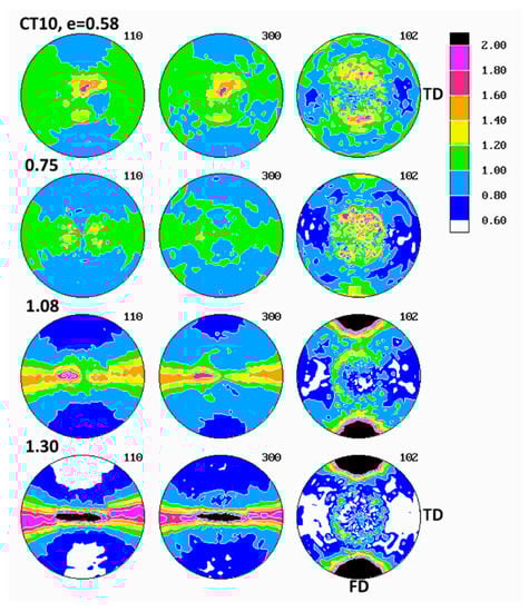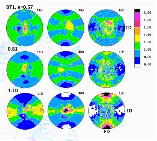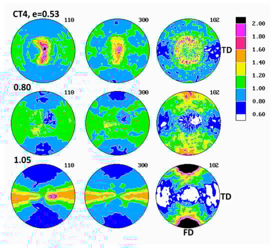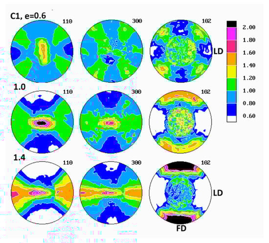 The pole figures determined for samples deformed in tension are presented in Figure 11, Figure 12, Figure 13, Figure 14 and Figure 15. Here, in drawn samples, it was possible to collect the diffraction data and construct pole figures only for samples deformed to a relative high strain, above e = 0.58, due to the neck developing in tensile samples at lower strain. Consequently, it was difficult to find in the specimen drawn to a low strain an area of uniform deformation large enough for pole figure measurements, during which a specimen must be highly tilted and rotated—the specimens at least 1 × 1 cm2, required for pole figure determination with our diffractometer, had to be selected from the necked uniform part of tensile specimens, away from the non-uniform neck shoulders. Comparing the pole figures of various tensile samples, it was found that the texture development in the studied applied strain range of e ≈ 0.6–1.1, proceeded in a remarkably similar fashion in all materials, regardless of their composition, yet it was noticeably different in the same materials deformed by plane-strain compression.