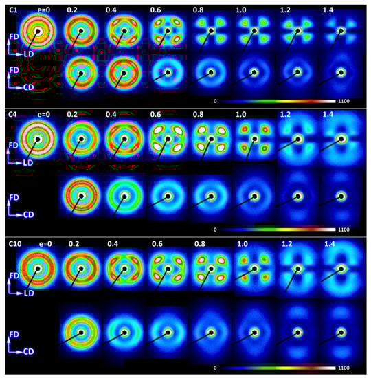 The 2-D SAXS patterns of samples of C1, C4 and C10 copolymers deformed to various strain (indicated) in the plane-strain compression. Patterns obtained in transmission with the primary beam along CD (first, third and fifth row) and along LD (second, fourth and sixth row). The flow direction (FD) is vertical.