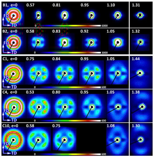 The 2-D SAXS patterns of samples of B1m B2, C1, C4 and C10 deformed to various strain (indicated) in tension. Patterns were obtained in transmission with the primary beam normal to the sample surface. The drawing/flow direction (FD) is vertical.