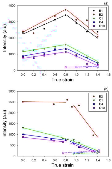 Figure 1b presents the representative true stress–true strain curves obtained in the second experiment, for samples deformed in uniaxial tension, also at room temperature. These curves were calculated from the load–displacement data combined with actual sample cross-section and the local extension (determined from increasing distance between ink marks), both determined from sample images recorded during stretching in function of the displacement. True stress–true strain curves of similar shape were obtained for iPB-1 by Weynant et al. [11] and Al-Hussein et al. [19]. The homo- and copolymer samples yielded with the formation of a distinct neck upon drawing, which was relatively sharp in homopolymers and diffuse in copolymers of high ethylene content. As the neck was formed, a whitening of the deforming section of the sample was also observed, very strong in B1 homopolymer, notably weaker in B2 and nearly absent in C1 copolymer. Deformation of C4 and C10 proceeded without any whitening. Sample whitening is an indication of an extensive cavitation of the material occurring during yielding, especially in homopolymer samples [34,49]. As a result of yielding and neck formation, the raw load–extension curves exhibited a common yield tooth (a distinct local maximum separating elastic and plastic stages of deformation), sharp in homopolymers and progressively broadening and lowering in copolymers with increasing ethylene content. However, this maximum disappeared when the load–displacement curves were transformed into the true stress–true strain curves, demonstrating that the maximum observed in the tensile load–displacement curve of iPB-1 was apparently related entirely to the reduction of the sample cross-section when the neck was formed, similar to many other polymers [46]. The tensile curves converted to the true stress and true strain units (marked with thick solid lines in Figure 1b) took a shape similar to the respective compression curves (marked with thin dashed lines). The stress in tension was, however, much lower than in compression of the respective material at any stage of the deformation process. One of the reasons was the friction of the deforming sample against the walls of the channel-die, which increased the load in compression. The second was the dependence of the plastic resistance of polymer crystals on the normal stress component acting perpendicular to the slip plane [50], which resulted in an increase of the macroscopic yield and plastic flow stresses in compression, while in their reduction in tensile deformation mode [51]. The third—and in our opinion the most significant one—was the dilatation of the amorphous phase during deformation, including cavitation phenomena, which could notably reduce the stress calculated from the load, since the real cross-section area of the sample was actually smaller than calculated from its external dimensions [34]. Another feature of tensile deformation was that samples demonstrated strain hardening similar to that observed in compression, manifesting in similar slopes at high strains, yet usually fractured much earlier, at lower strain and much lower stress than samples deformed in plane-strain compression. Specimens of the low aspect ratio (width of the specimen in the narrow section being close to the length of this section) used primarily in this study fractured below the true strain of e = 1.1, although other specimens, with larger aspect ratio of 5 (GL = 25 mm, w = 5 mm), used in a few additional tensile experiments, were able to deform to the true strain above 1.3 before break. Another interesting observation is that the B1 homopolymer demonstrated in tension the stress similar to or even lower than B2 at large strains, in contrast to compression, where B1 demonstrated higher stress than B2 in the entire strain range. Such behavior in tension can be related to significantly stronger cavitation observed in B1 than in B2.