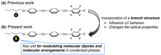Recently, our group developed families of pentafluorinated tolane [13] and bistolane derivatives with alkoxy-type flexible chains (Figure 1a) [14,15] as promising LE materials and revealed that their PL can change depending on the electron-density distribution [16] or the molecular arrangement in the aggregated structure [13,14,15]. It was of great interest that the bistolane-type LE molecules showed not only PL, but also liquid-crystalline (LC) properties, namely light-emitting liquid crystals (LELCs) [17,18,19,20], and the PL behaviors were found to change through the crystal (Cr) ⇄ LC thermal phase transition. In addition, we recently developed novel LELCs with V- or Y-shaped molecular geometry, which showed intriguing switching characteristics induced by thermal stimulus [21].