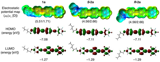 Electrostatic potential map, dipole moment (μ), HOMO diagram, and LUMO diagram for 1a, S-2a, and R-2a according to density functional theory (DFT) calculations performing using CAM-B3LYP/6-31+G(d) with the conductor-like polarizable continuum model (CPCM) model (CH2Cl2).