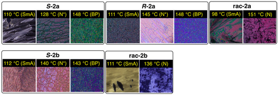 All bistolane derivatives with 2-chloroalkoxy flexible units showed LC phases during both heating and cooling. In the DSC measurements, S-2a displays a LC phase during the heating process, while two LCs are observed during cooling. The POM results obtained during heating reveal dynamic phase changes from the Cr phase with a nonfluidic bright-viewing field to the LC phase with a fluidic bright-viewing texture at 130 °C and from the LC phase to an isotropic (Iso) liquid phase with a fluidic dark-viewing field at 148 °C. The POM image of the LC phase displays a Grandjean texture, which is one of the characteristics of a chiral nematic (N*) phase. Upon cooling, on the other hand, a platelet texture between 146 °C and 148 °C and a fan-shaped texture between 97 °C and 112 °C, as well as a Grandjean image (N* phase), are observable via POM. The former platelet texture is typical of optical images for a blue phase (BP) [32,33,34,35,36], and the latter is typical for a smectic (Sm) phase. Considering the phase transition enthalpy and the texture change from bright to dark induced by shearing, the Sm phase can be assigned to the smectic A (SmA) phase [14,15]. The phase transition behavior of R-2a is almost identical to that of S-2a, whereas rac-2a, a racemic mixture, showed SmA and nematic (N) phases, not the N* phase, during both heating and cooling cycles, and a somewhat lower melting temperature (Tm) [37] compared to those of the chiral derivatives. In the case of 2-chlorohexyloxy-substituted bistolanes, e.g., S-2b and rac-2b, a similar phase transition was observed, but the transition temperature, i.e., Tm and the clearing temperature (Tc), in the cooling cycle slightly decreased (Tm = 88–89 °C and Tc = 143–144 °C) in comparison with those for the S-2a (Tm = 97 °C and Tc = 148 °C) and rac-2a (Tm = 102 °C and Tc = 148 °C) carrying the flexible 2-chloropentyloxy chain. In comparison with the previously reported phase transition behaviors of the linear analogues 1a and 1b [15], introduction of Cl into the flexible chain did not significantly change Tm, but did cause a dramatic decrease in Tc. In addition, the Cl substitution in a chiral fashion caused a dramatic change in the appearance of the LC phase, resulting in both N* and BP phases.