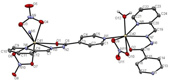 Anisotropic displacement ellipsoid diagram of 1 with a view of coordination environments around Cd1 and Cd2 centers. Thermal ellipsoids are at 30% probability. N5 atom was generated by a symmetry operator (−1 + x, +y, −1 + z).