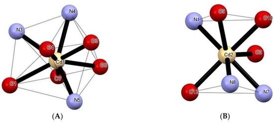 Representation of (A) dodecahedral and (B) monocapped trigonal-prismatic geometries of Cd1 and Cd2 atoms in 1.
