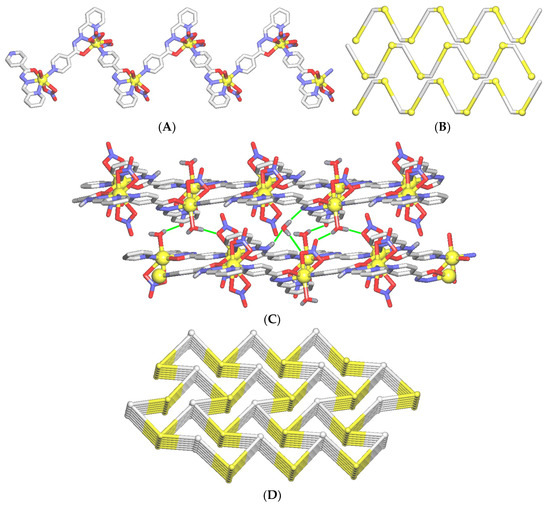 Topological analysis of the 1D coordination polymer 1 and its 3D H-bonded network was performed with ToposPro by applying a concept of the underlying (simplified) net [52,53]. A simplified 1D coordination network was obtained by omitting the terminal ligands and contracting the bridging ligands to the respective centroids. A simplified 3D H-bonded net was generated by contracting the [Cd(L)(NO3)(H2O)] and [Cd(HL)(NO3)2] blocks to centroids, maintaining their connectivity via coordination and hydrogen bonds. Only strong H-bonds (D-H∙∙∙A) were taken into account, with the H∙∙∙A < 2.50 Å, D∙∙∙A < 3.50 Å, and ∠(D−H∙∙∙A) > 120°; D and A refer to donor and acceptor atoms [52,53]. For simplicity, crystallization H2O molecules were disregarded in topological analysis. Topological classification of the generated nets was then performed.