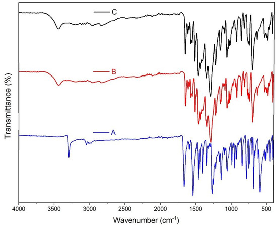 FT-IR spectra of (A) HL, (B) single crystals of 1, and (C) nanoparticles of 1.