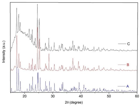 Powder X-ray diffraction patterns of coordination polymer 1: (A) simulated from single crystal X-ray data, (B) prepared via a branched tube method, and (C) prepared by a sonochemical synthesis.