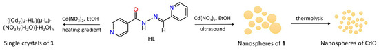 Considering all these points, and following our interests in crystal engineering, design of novel coordination polymers and derived functional materials [37,38,39,40,41,42,43,44], we focused our attention on developing a sonochemical synthetic approach for the preparation of a new cadmium(II) coordination polymer as a precursor for nanospheres of CdO. Another objective of this study is to synthesize different forms of Cd(II) CPs, namely nanopsheres and single crystals, by exploring the same type of the reaction mixture whilst using distinct synthetic methods (i.e., sonochemical synthesis and branched tube methods, respectively; Scheme 1). Thus, in this study, we report the two different synthetic pathways, crystal structure, topological features, and full characterization of a new 1D coordination polymer {[Cd2(µ-HL)(µ-L)(NO3)3(H2O)]·H2O}n (1), which was assembled from cadmium(II) nitrate and pyridine-2-carboxaldehyde isonicotinoyl hydrazone (HL) in ethanol as a green reaction medium. In addition, the obtained nanospheres of 1 were used for the preparation of CdO nanoparticles with spherical morphology (Scheme 1).