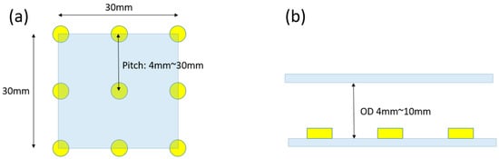 Figure 1 shows the schematic diagram of three types of mini-LED, which are (a) CSP, (b) SMD, and (c) FDCSP. 100 μm × 100 μm flip chip is used in these three types of packages as their light sources. For CSP mini-LED, a 35 μm thickness and 90% concentration of phosphor layer is deposited on the chip, then a transparent silicone is molded on the top of the phosphor layer. The particle size called D50 and D90 of commercial phosphor is about 15 μm and 25 μm, respectively. D50 is the average of particle size. D90 describes the diameter where 90 % of the distribution has a smaller particle size and 10% has a larger particle size. Based on these values, 35 μm for the phosphor layer is close to the design limitation. Using the phosphor concentration of 90% for both CSP and FDCSP can meet the backlight color temperature criteria, which is 10,000 K. The size of CSP mini-LED is 1.5 mm × 1.5 mm × 0.8 mm. The optimization of thickness of CSP phosphor layer and CSP package referred to the previous work [6]. For SMD mini-LED, chip is mounted in a cavity substrate, and phosphor is evenly distributed in the cavity with concentration 10% to meet the 10,000 K backlight color temperature. For FDCSP mini-LED, a 35 μm thickness and 90% concentration of phosphor layer is deposited on the chip, then a transparent lens with freeform surface design is molded. We analyzed the light source efficiency and illuminance angle by Light Tools™ (Synopsys Inc, Mountain View, CA, USA) for these three kinds of light sources, and then model the module as shown in Figure 2. The size of module architecture is 30 mm × 30 mm. For the light performance of module using CSP, SMD, and FDCSP, MATLAB is used to call the Lighttools API and numerical operations. There are two important parameters to analyze the performance of the module. One is the distance between the light source and the receiving surface. This parameter is called optical distance, “OD”. The other is the arrangement of the light source arrays, this parameter called “Pitch”. Spot uniformity and energy efficiency of module using three types of packages will be evaluated based on these two parameters, OD and Pitch. These two parameters are very important to the evaluation of the direct-lit backlight system [19,20,21]. If the OD is smaller, it means that this backlight module is thinner. If the Pitch is larger, it means that less LEDs are used in this module.