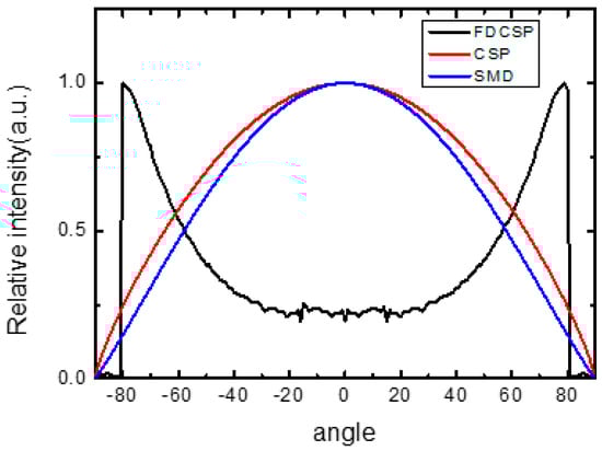 Firstly, we analyze the energy loss and spot characteristics of the light source components. Through Lighttools simulation, Figure 3 records the illumination angles of the three light sources CSP, SMD, and FDCSP, respectively. The CSP source has an illumination angle of 130 degrees and a Gaussian distribution, while the SMD has an illumination angle of 120 degrees, which is also a Gaussian distribution. More specifically, the FDCSP has a 160 degrees bat wing distribution pattern.