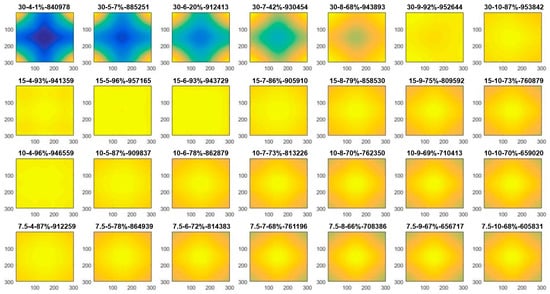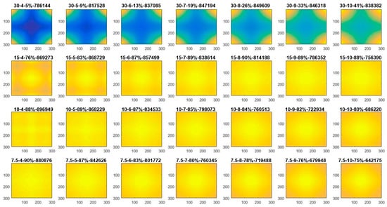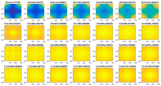 Then, the CSP, SMD, and FDCSP light sources are analyzed in the module, respectively. The module parameter “OD” is 4 mm to 10 mm, the step is 1 mm; and the module parameter “Pitch” is 30 mm, 15 mm, 10 mm, and 7.5 mm, respectively. Figure 5, Figure 6 and Figure 7 show the module operation results of CSP, SMD, and FDCSP, respectively. The file name format of each thumbnail in the picture is “Pitch-OD-Uniformity-Intensity”. For example, the name “7.5-4-87%-912259” of picture means that the pitch of LED array is 7.5 mm, OD is 4 mm, and backlight module uniformity is 87%, and the intensity is 912,259 nits. The uniformity is defined, as shown in Equation (1).
