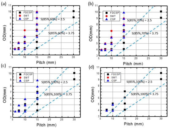 In order to further discuss the optical phenomenon in the unsaturated interval, we take the parameters of each image and normalize the simulation results of each condition based on the Intensity of CSP at OD = 4 mm and Pitch = 30 mm, as shown in Table 1. First of all, we can clearly observe that the module intensity of FDCSP scheme is much higher than that of CSP and SMD because the light extraction efficiency of FDCSP is better than CSP and SMD. Therefore, the overall efficiency of the intensity is more than 130%. In contrast, the SMD is not efficient due to the low package efficiency of initial light source. The normalized intensity value is only about 70%. Then, in order to further distinguish the capabilities of each light source scheme, this study is aimed at S (85%, 60%), S (85%, 70%), S (85%, 100%), and S (85%, 110%) to draw a strategy map with different conditions. Figure 8 demonstrates the strategy map of S (85%, 60%), S (85%, 70%), S (85%, 100%), and S (85%, 110%), respectively. Due to poor efficiency, the SMD series has no solution at S (85%, 100%) and S (85%, 110%). Additionally, the CSP only has smaller OD solutions at S (85%, 110%) as the threshold of intensity increases. It is worth mentioning that the FDCSP solution has not changed significantly under any conditions.