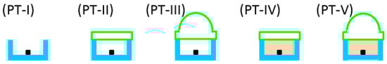 The Figure 1 illustrates the structures of five different package types (PTs): PT-I is a DUV-LED without a quartz plate, PT-II denotes a conventional flat type DUV-LED, PT-III stands for a conventional lens type DUV-LED, PT-IV is a flat type liquid packaging DUV-LED, and PT-V denotes the lens-type liquid packaging DUV-LED proposed in this study. In Figure 1, the black part is the DUV-LED chip. The blue part is the ceramic substrate with an Au coating. The green part is a quartz cover that has a flat type and lens type. The pink part is silicone oil in the cavity substrate. All the structures are composed of the same chip and ceramic substrate. For the DUV-LED chip, its output power and peak wavelength in the ceramic substrate was about 9.30 mW and 281 nm at 60 mA, respectively. The chip size was 250 × 500 × 200 μm. The chip structure was the flip chip type, so we use a refractive index of sapphire of about 1.82 in the UVC range [15] as the light source. The material of the cavity substrate was aluminium nitride and its size was 3.5 × 3.5 mm. A thin film of gold with a reflectance of 38% was plated on the bottom and the top of the cavity. The sidewall was AlN with 16% reflectance. There were two types of quartz plate placed on the top of the substrate. One was flat type and the other was lens type. The size of the flat type quartz plate and lens type quartz plate were 3.3 × 3.3 × 0.5 mm and 3.3 × 3.3 × 1.7 mm.